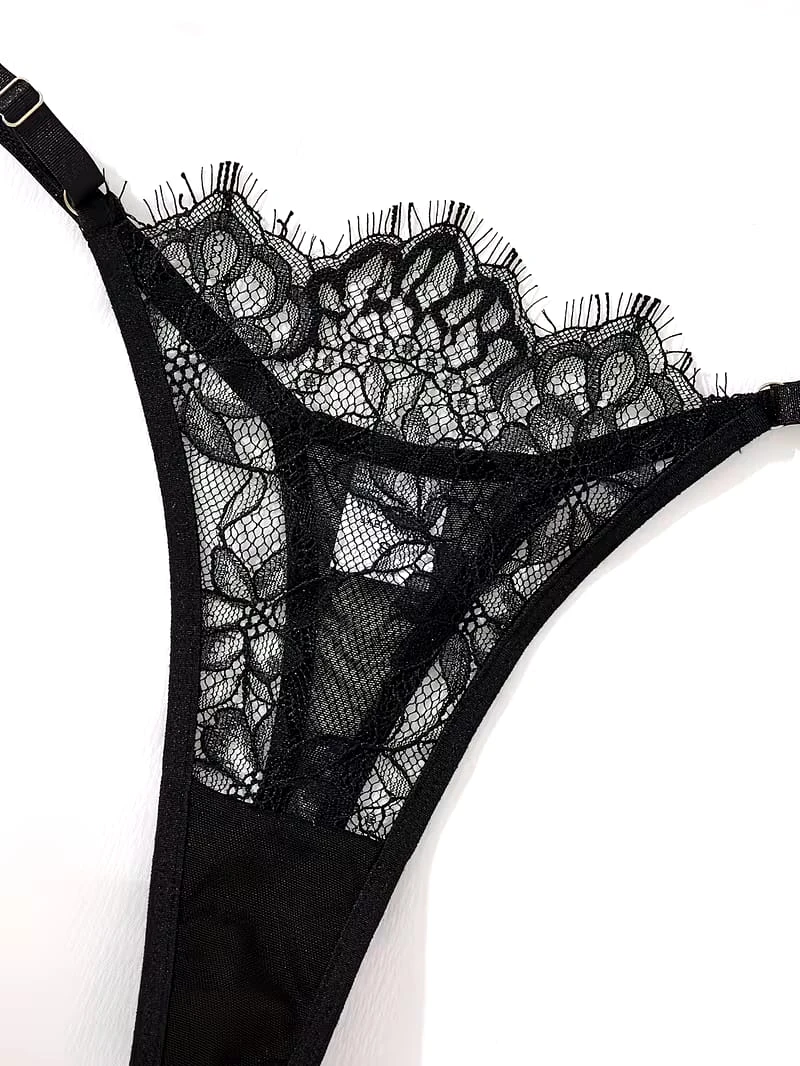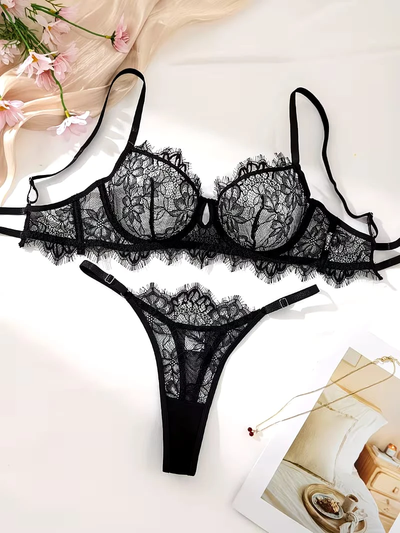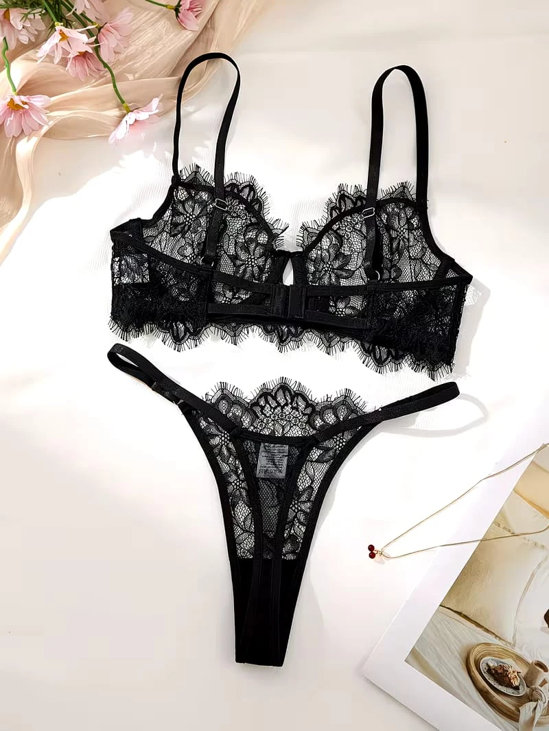 Elevate your intimate collection with this exquisite 2-piece black lace lingerie set. It features a sheer floral lace bra with delicate eyelash trim and underwire cups for superior support and a flattering lift. The set is completed with a matching lace thong, featuring adjustable side straps to ensure a perfect, comfortable fit. Crafted from high-quality, breathable lace for a romantic and sophisticated look.