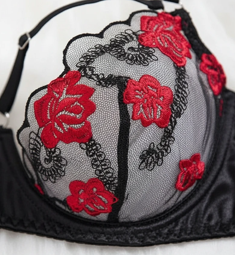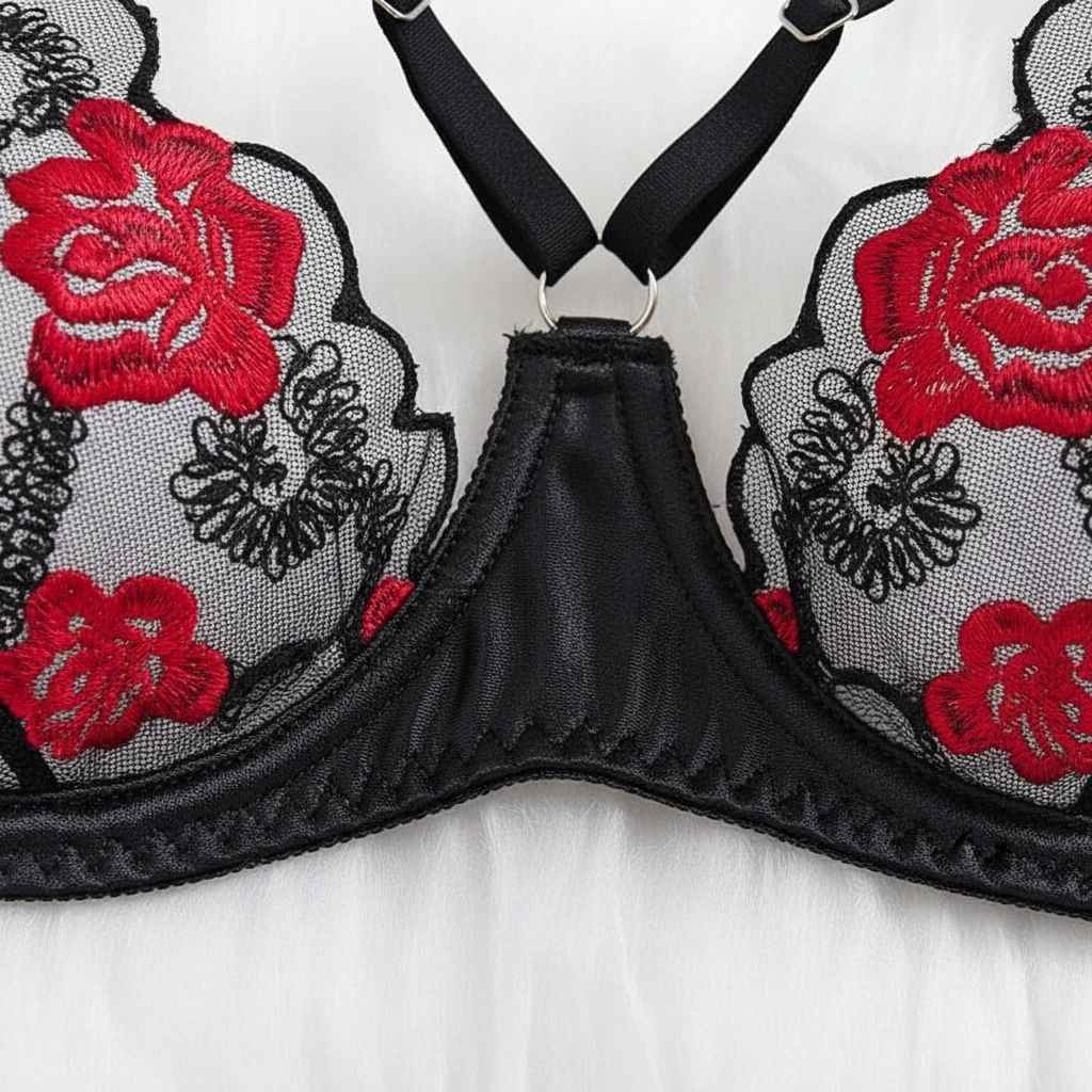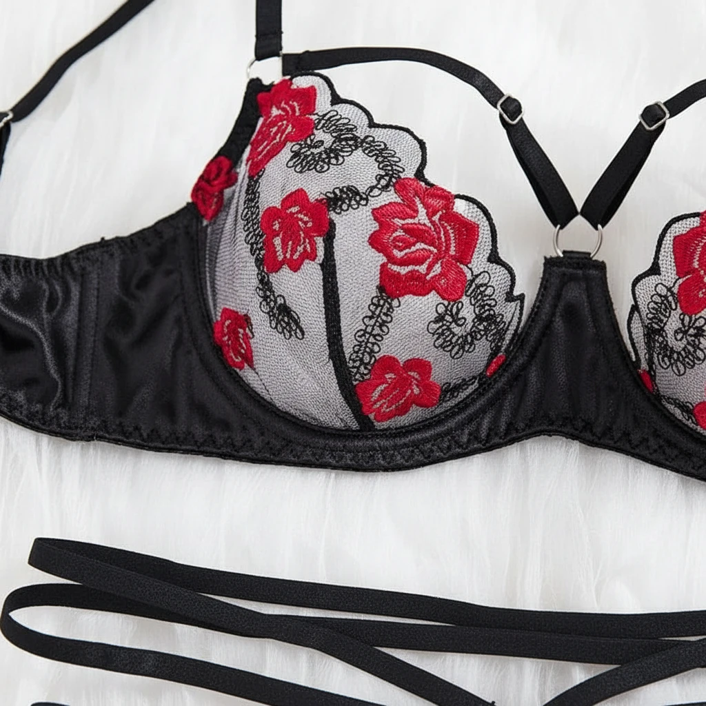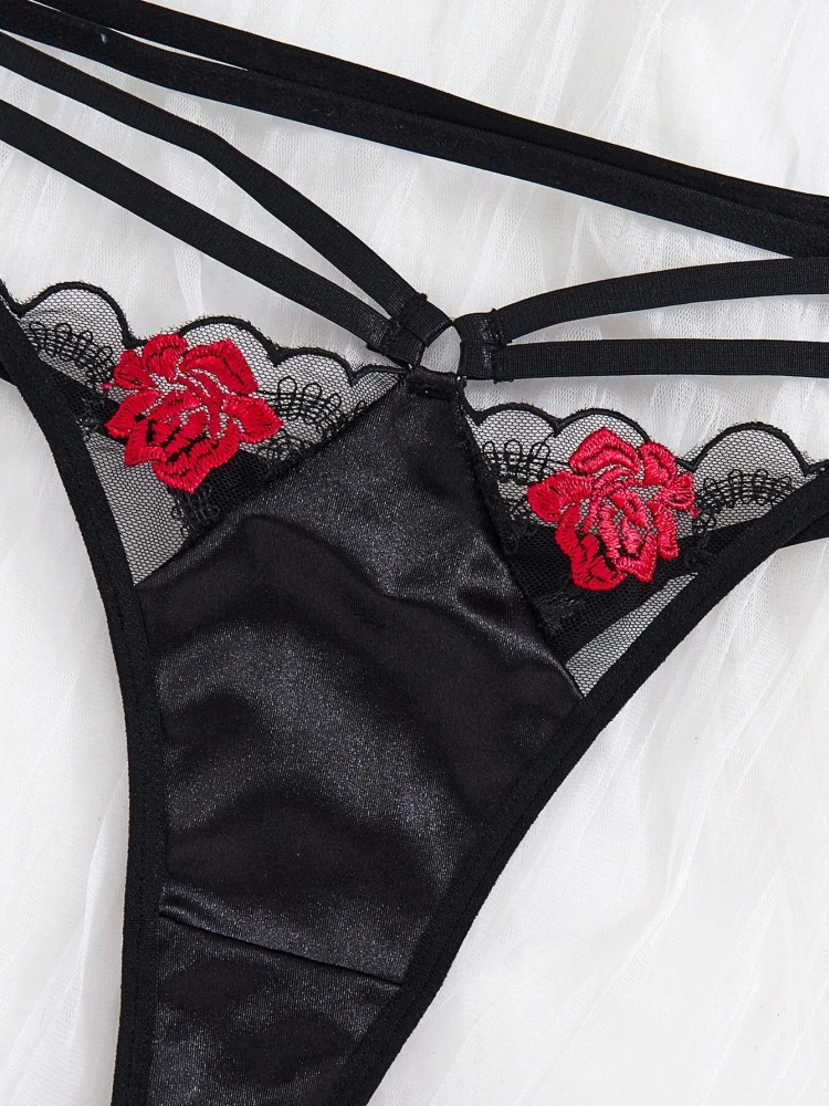 Elevate your intimate collection with this exquisite two-piece lingerie set. It features a sheer mesh bra adorned with vibrant red rose embroidery and trendy strappy detailing. The matching low-rise thong panty boasts double waist straps for a bold, seductive look. Crafted from a soft blend of satin and elastic lace, this set offers both comfort and a flattering fit