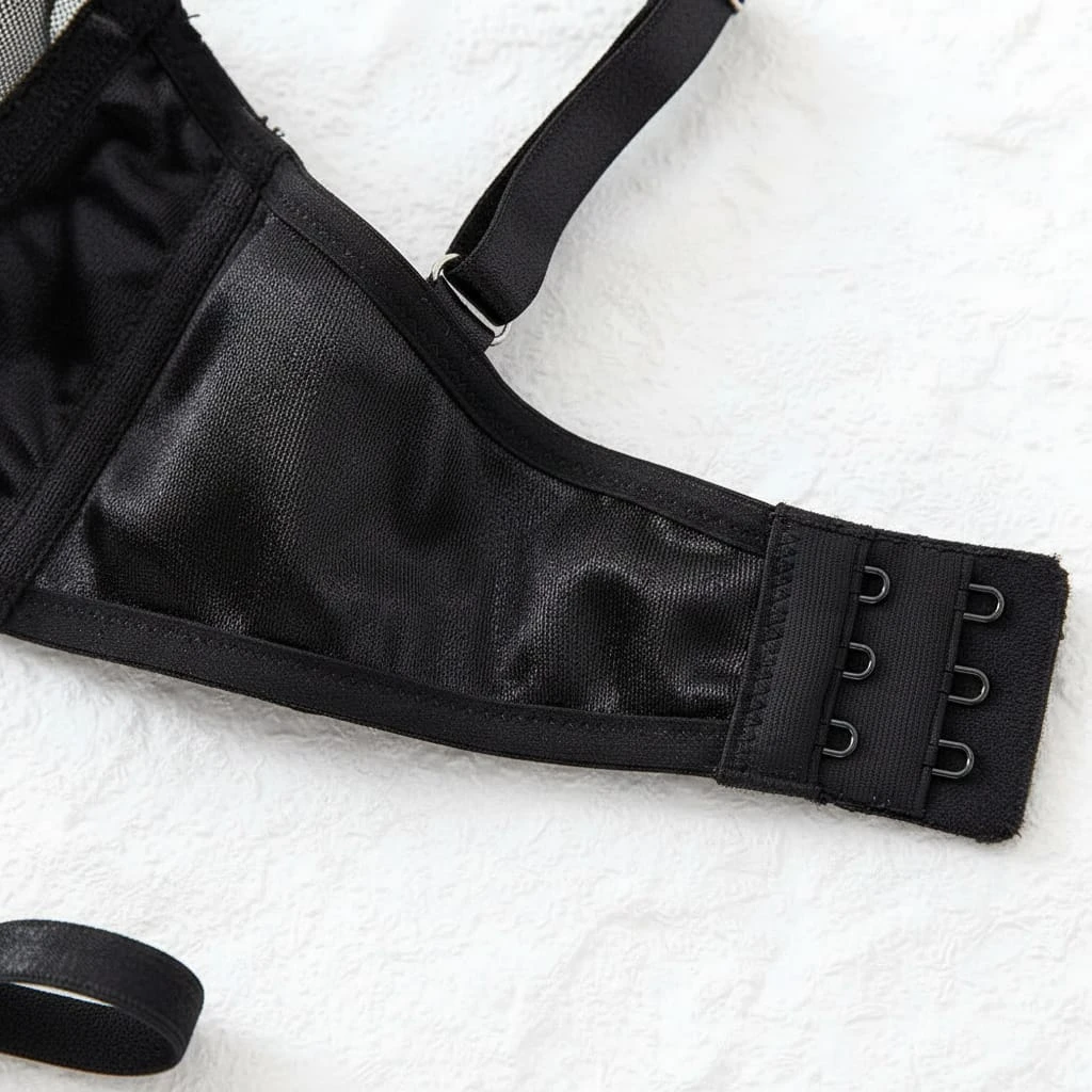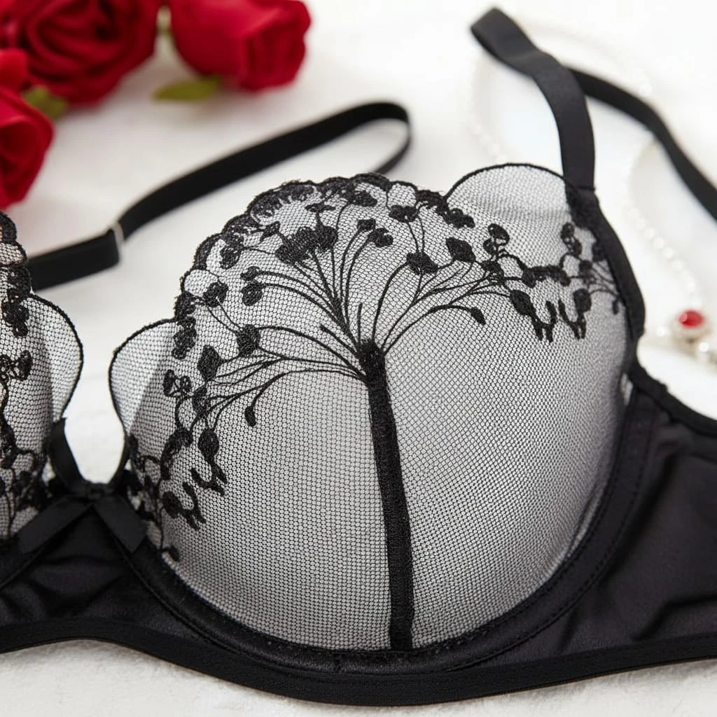 Experience elegance and sensuality with this 2-piece sheer black lingerie set. Featuring intricate daisy floral embroidery on delicate mesh fabric, the set includes an underwired push-up bra for perfect support and a matching low-rise thong. Crafted from soft, breathable, and stretchy lace, it’s designed to provide a comfortable fit while highlighting your natural curves.