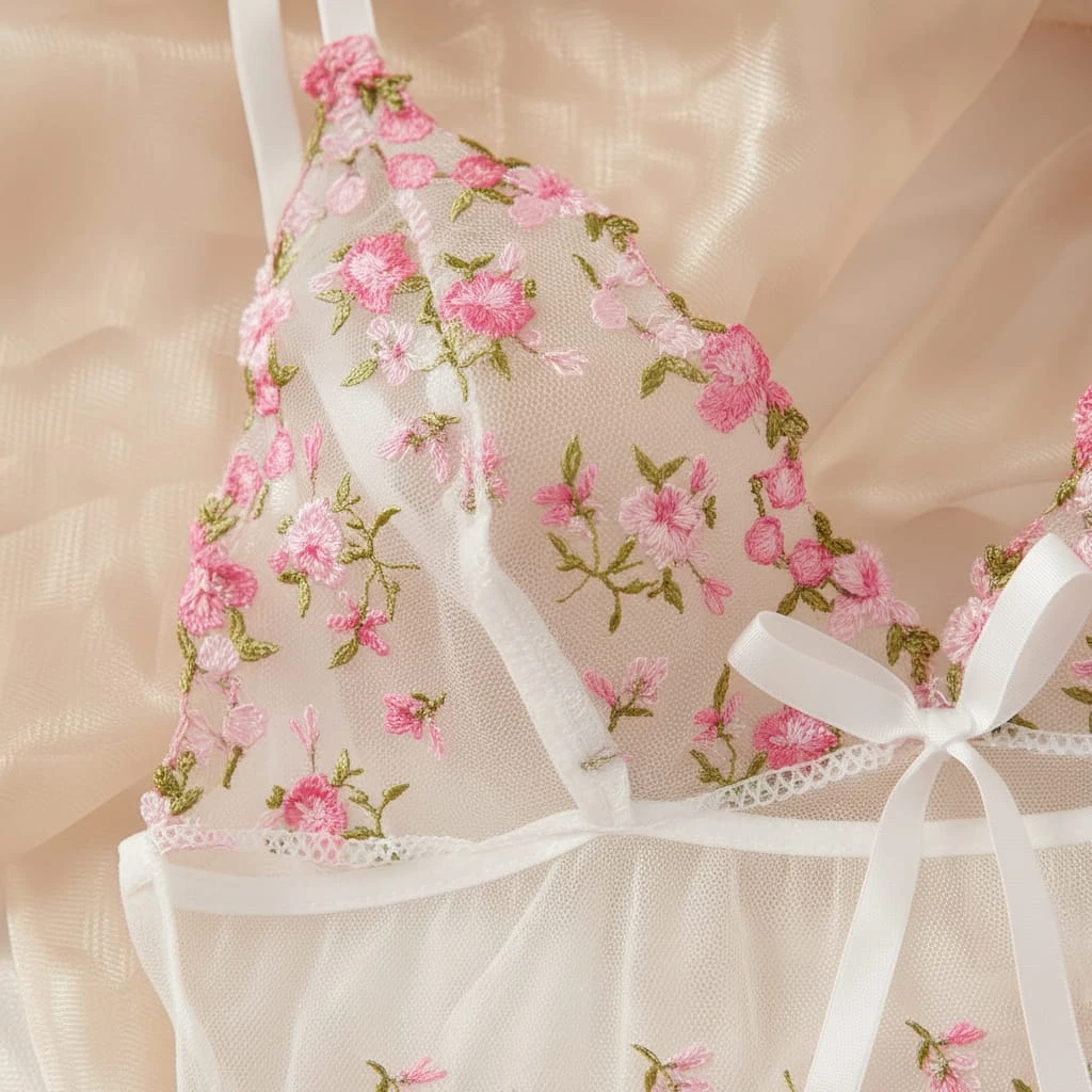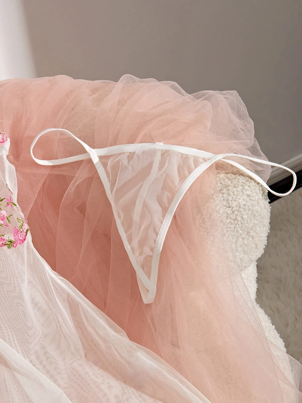 Elevate your romantic wardrobe with this enchanting 2-piece babydoll set. The sheer mesh slip dress features exquisite pink floral embroidery on the cups and waistline, adding a delicate feminine touch. Designed with adjustable spaghetti straps and a dainty front bow, it offers a flattering and comfortable fit. The set includes a matching sheer thong to complete this elegant and alluring look.