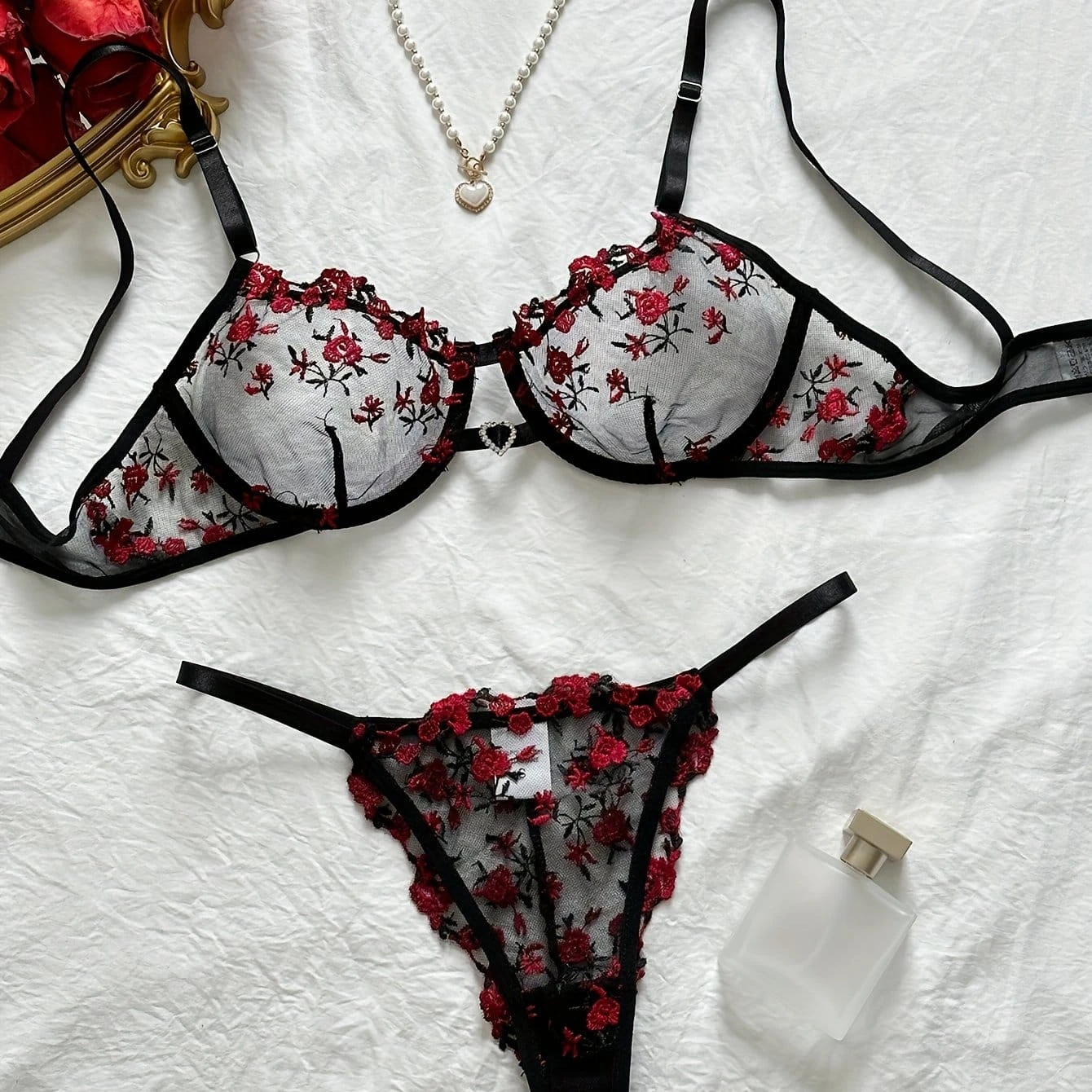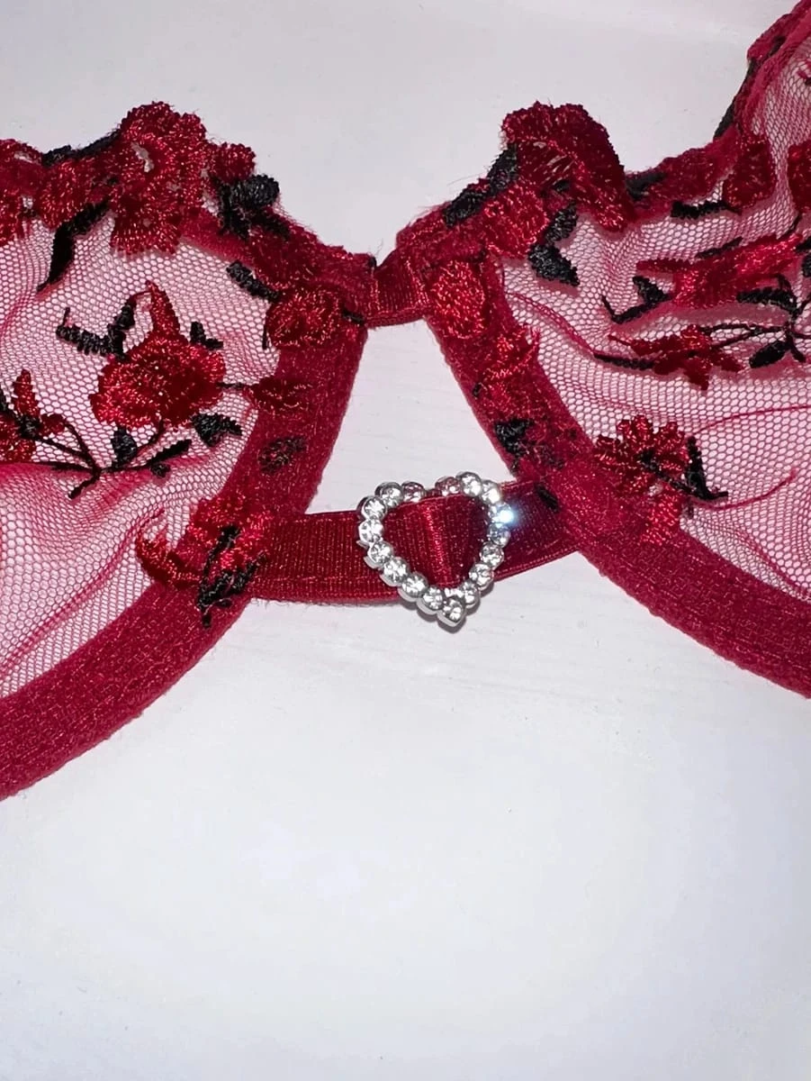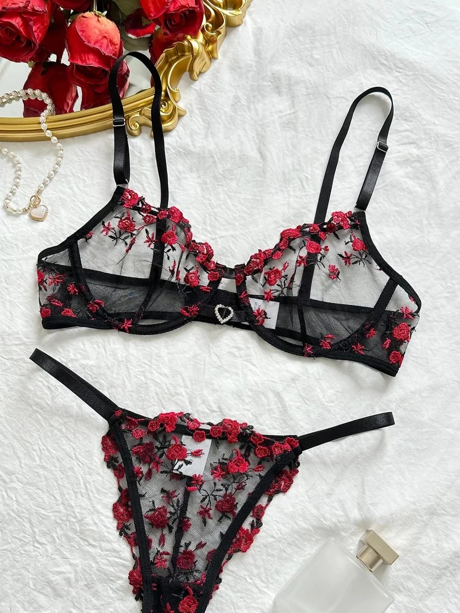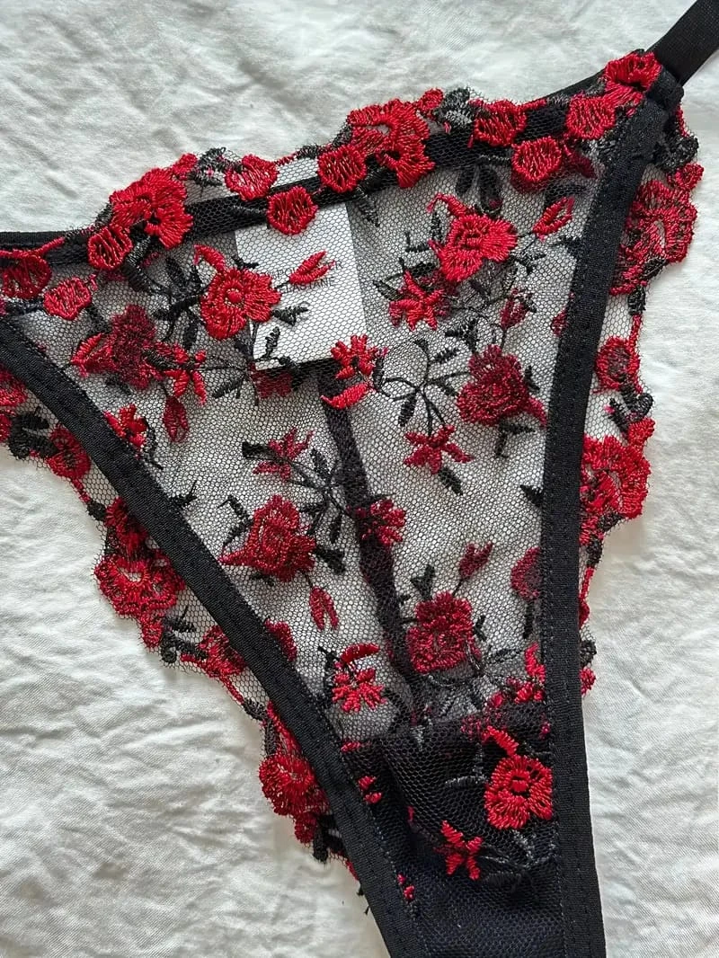 An elegant and sexy women's lingerie set in a vibrant coral red. This 2-piece set features an unlined, underwired sheer mesh bra that provides excellent lift and support, beautifully adorned with intricate red and black floral embroidery. It is paired with a matching embroidered G-string thong. The set includes adjustable spaghetti straps to ensure a comfortable and customized fit.