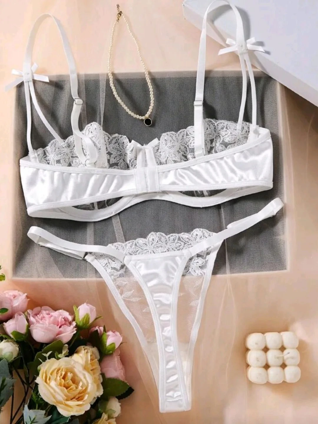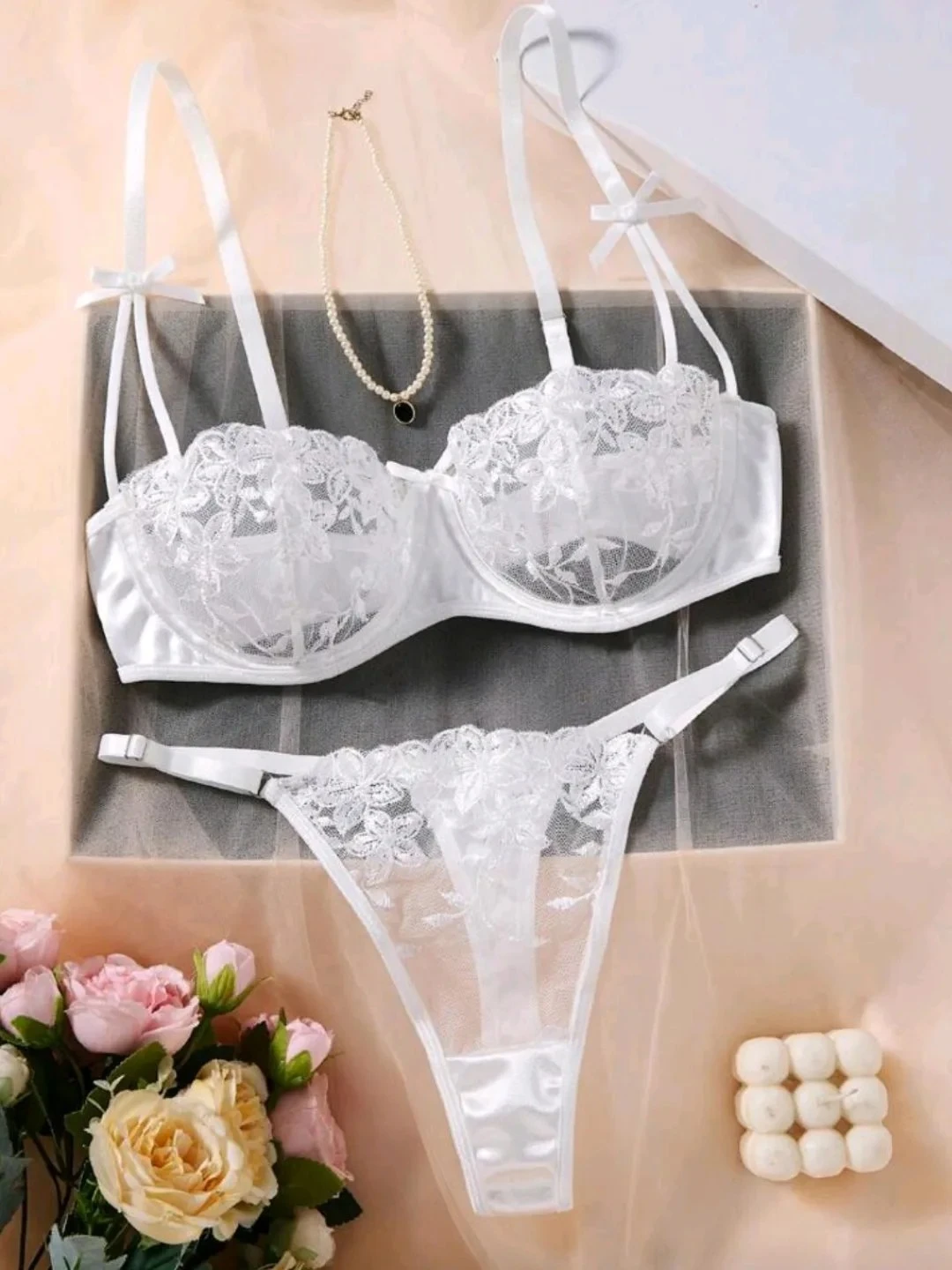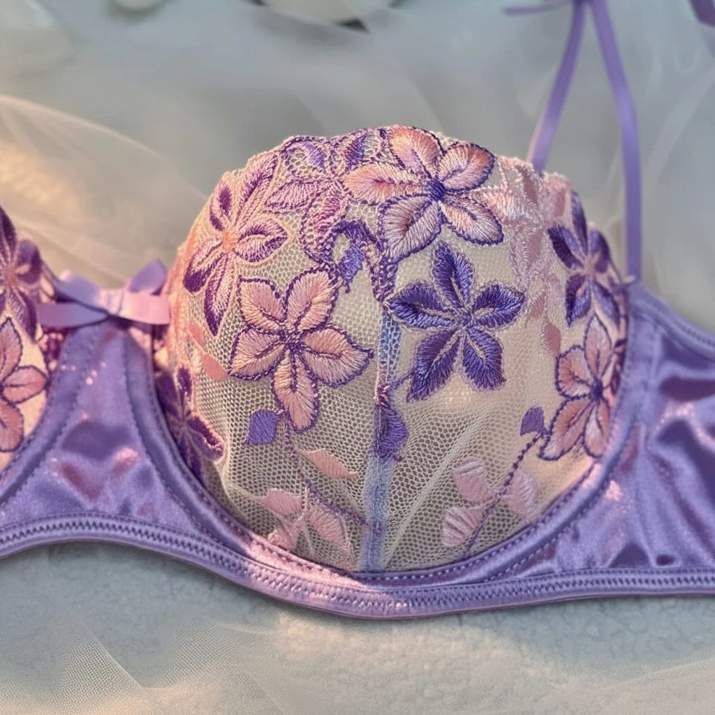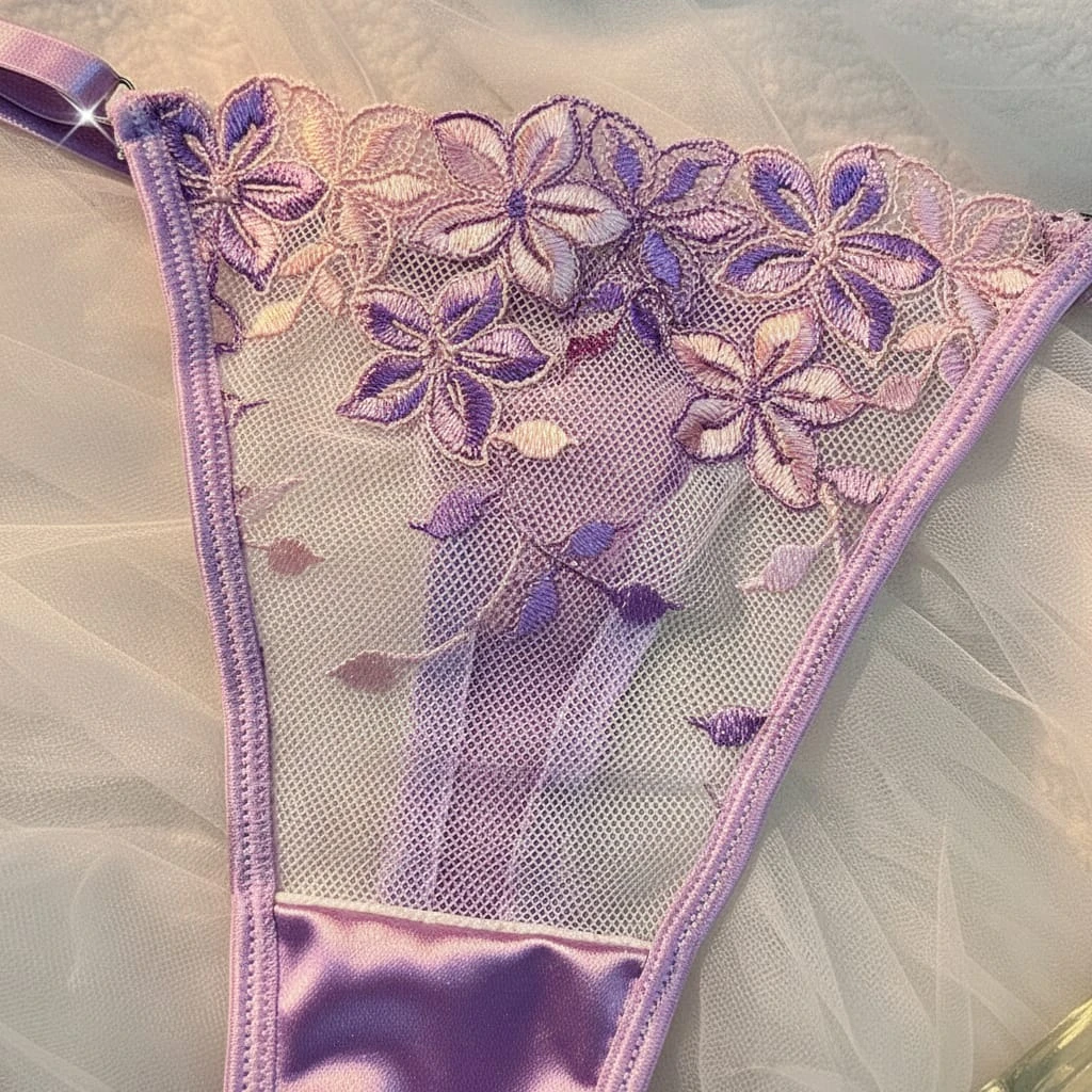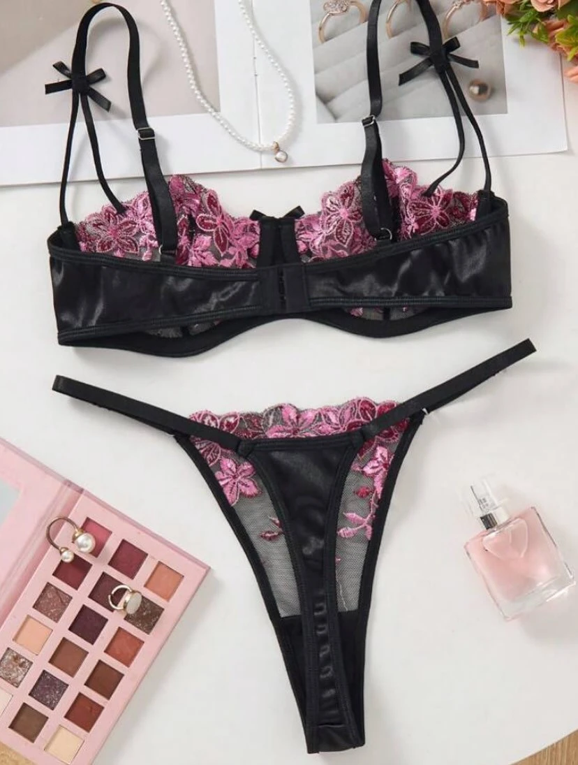 This exquisite lingerie set features intricate 3D floral embroidery layered over delicate sheer mesh. The underwire bra is framed with shimmering satin straps and side wings for a structured yet seductive silhouette. Accompanied by a matching embroidered thong, this set offers a blend of romantic aesthetics and high-end craftsmanship.