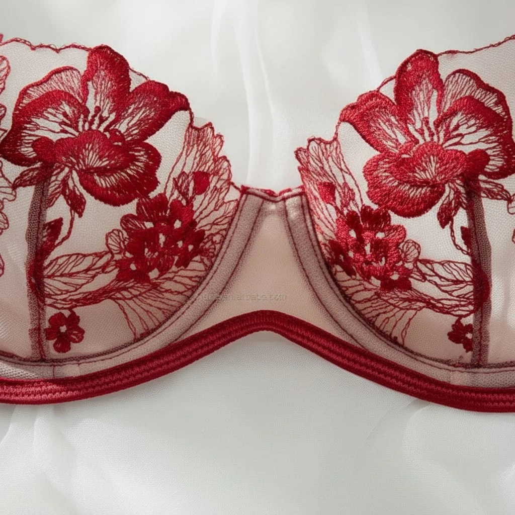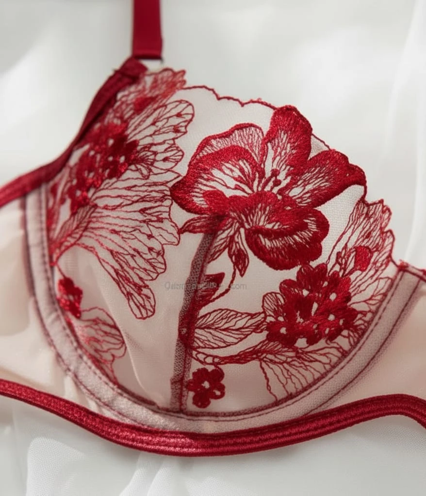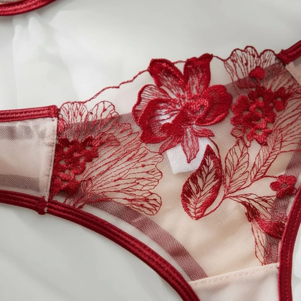 An elegant and seductive 2-piece lingerie set featuring a sheer mesh base adorned with vibrant red floral embroidery. The set includes an underwire bra for enhanced support and a matching thong. Designed with adjustable straps and delicate scalloped edges, this set offers a blend of comfort and high-end femininity.