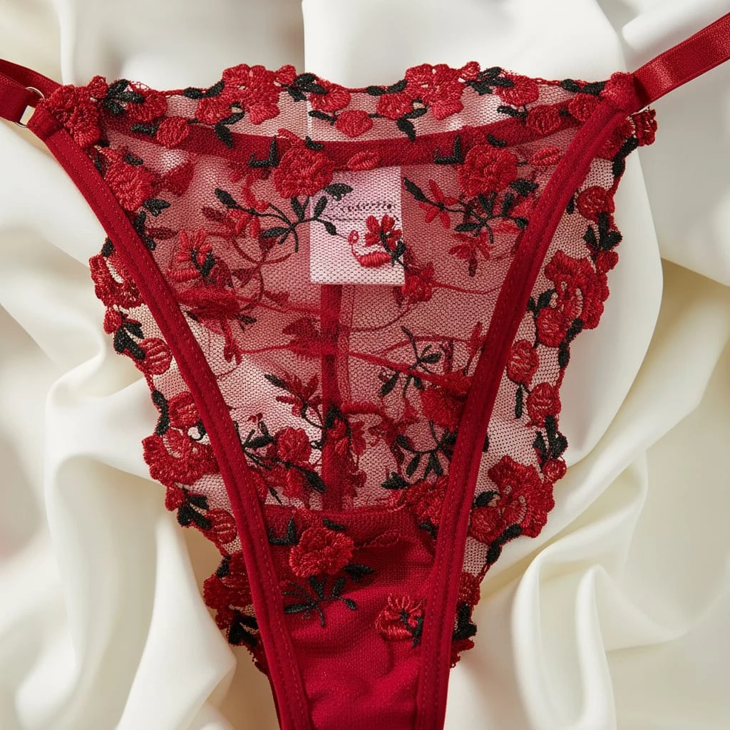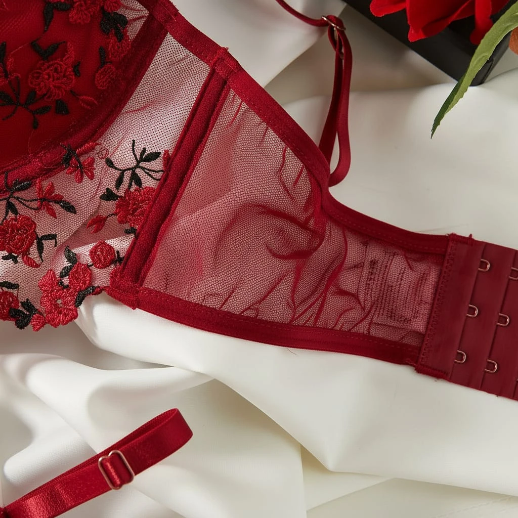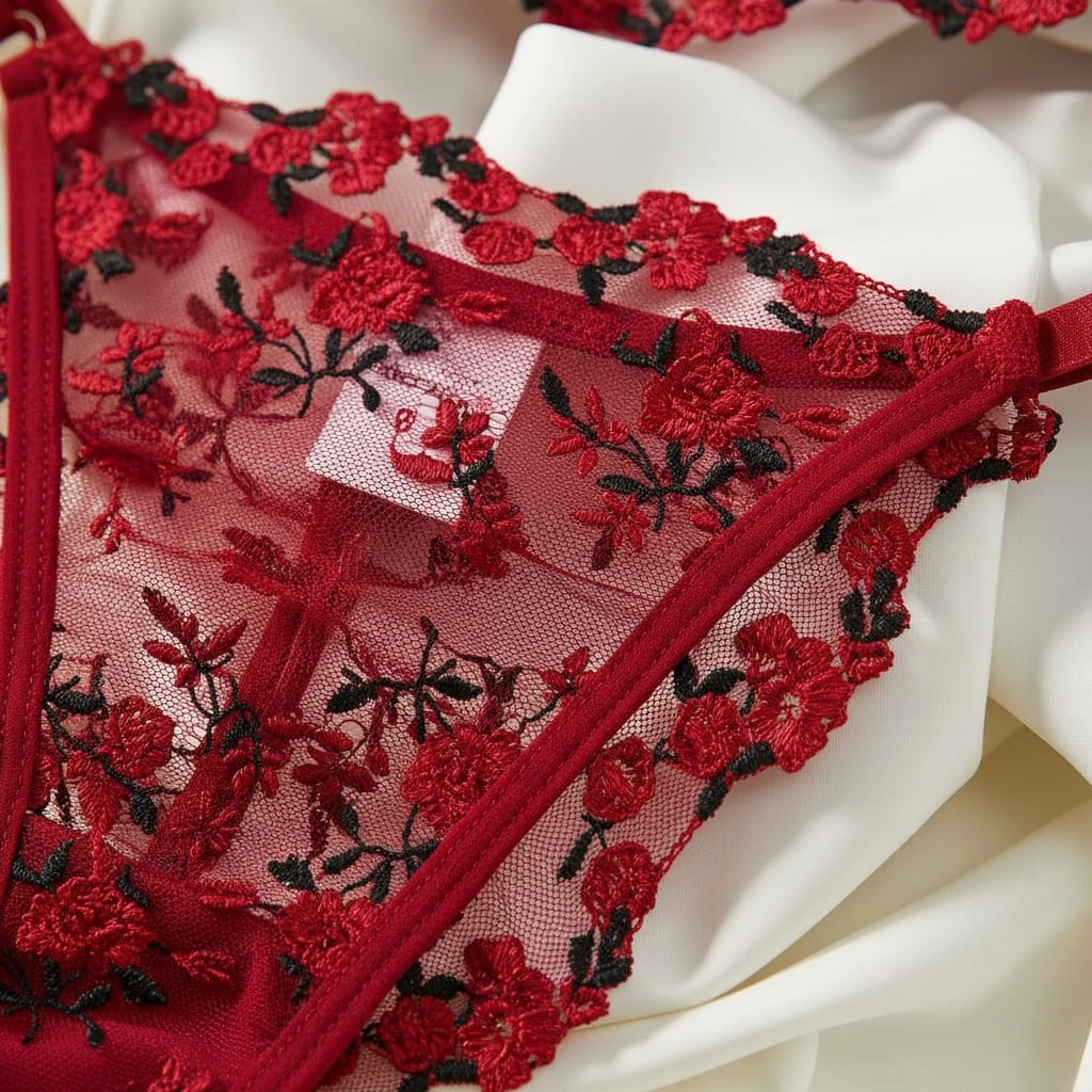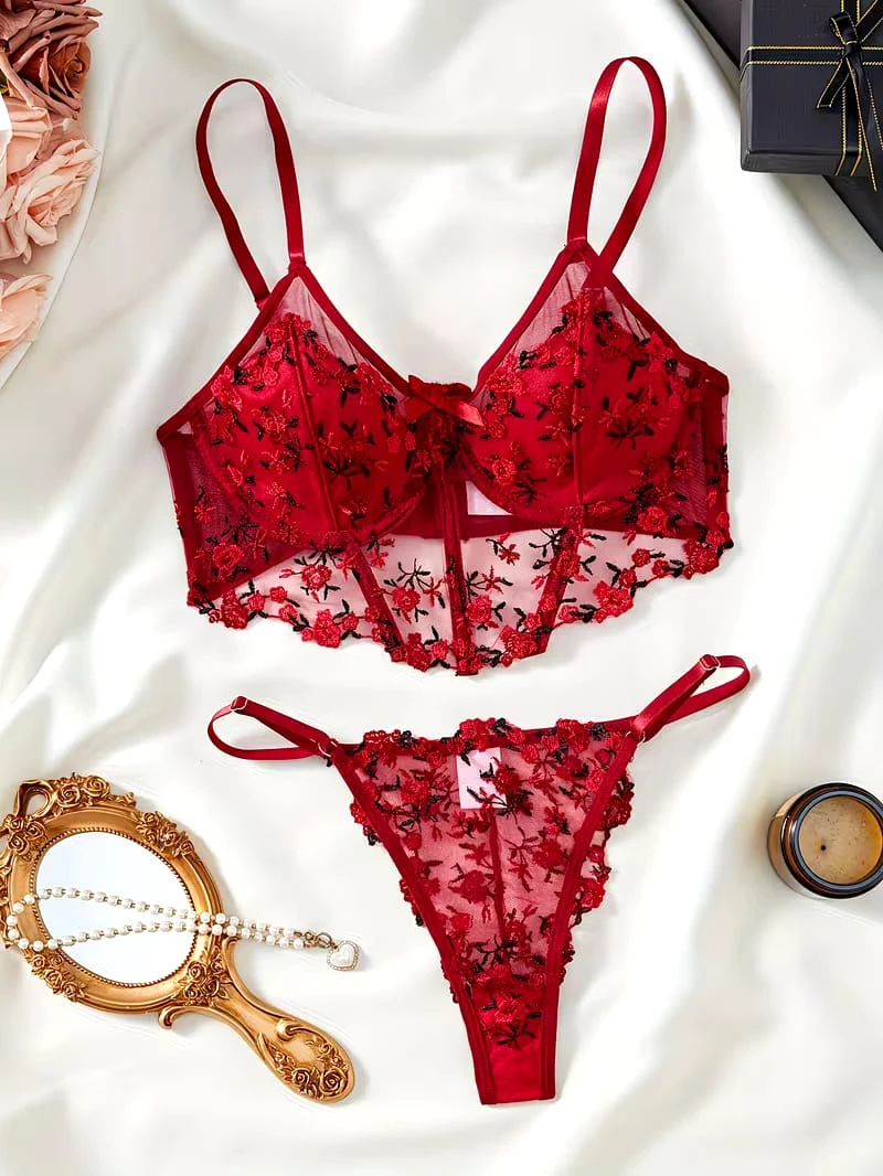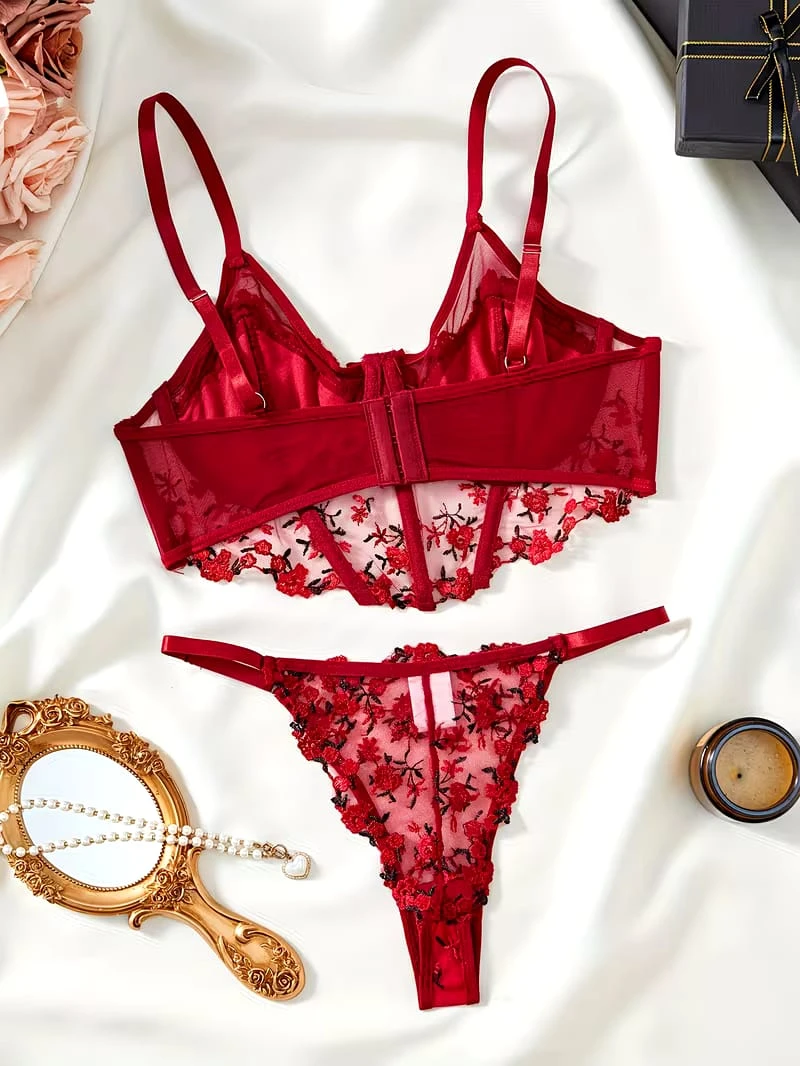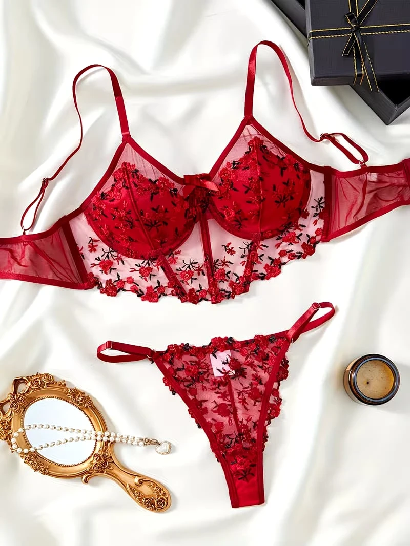 Embrace your femininity with this exquisite 2-piece red lingerie set. The underwired push-up bra provides excellent lift and support, featuring delicate sheer mesh adorned with intricate red and black floral embroidery. It comes with a matching sheer thong, both detailed with romantic floral motifs. Designed with adjustable straps and high-quality lace, this set is perfect for special occasions or adding a touch of luxury to your collection