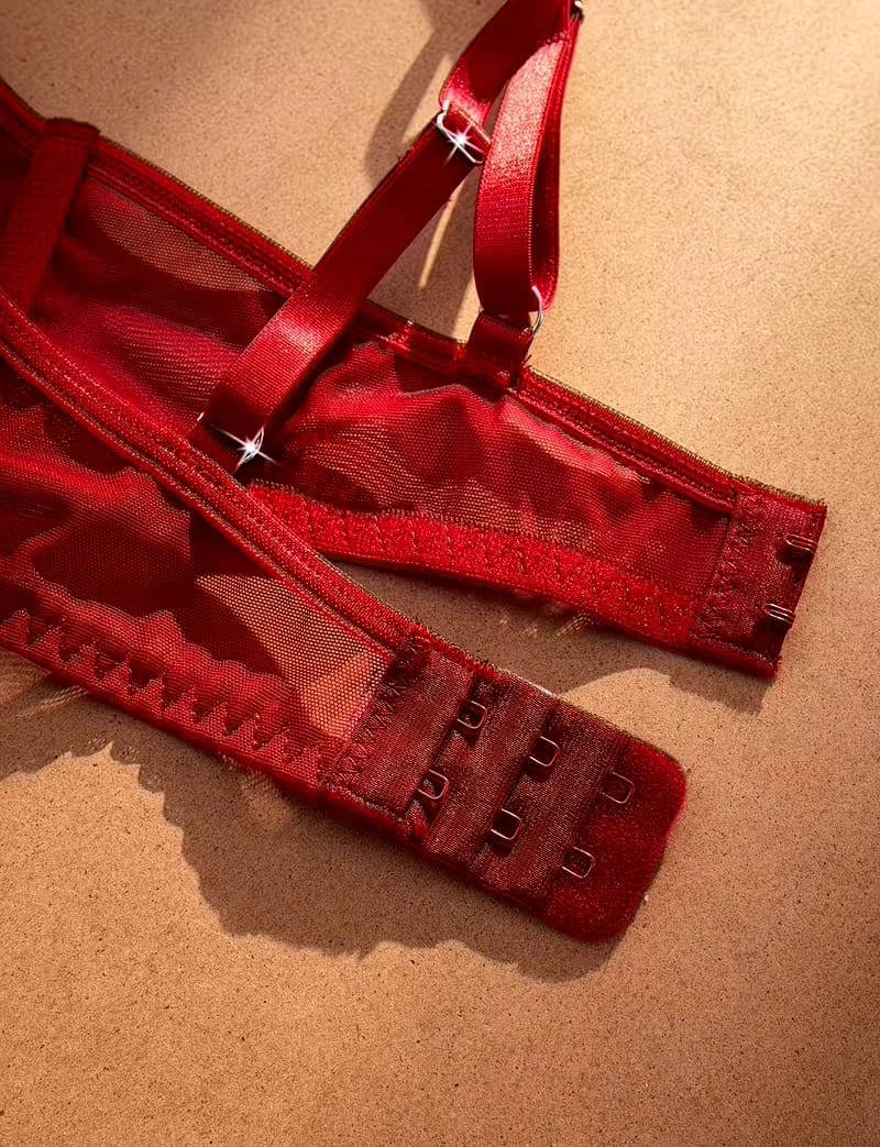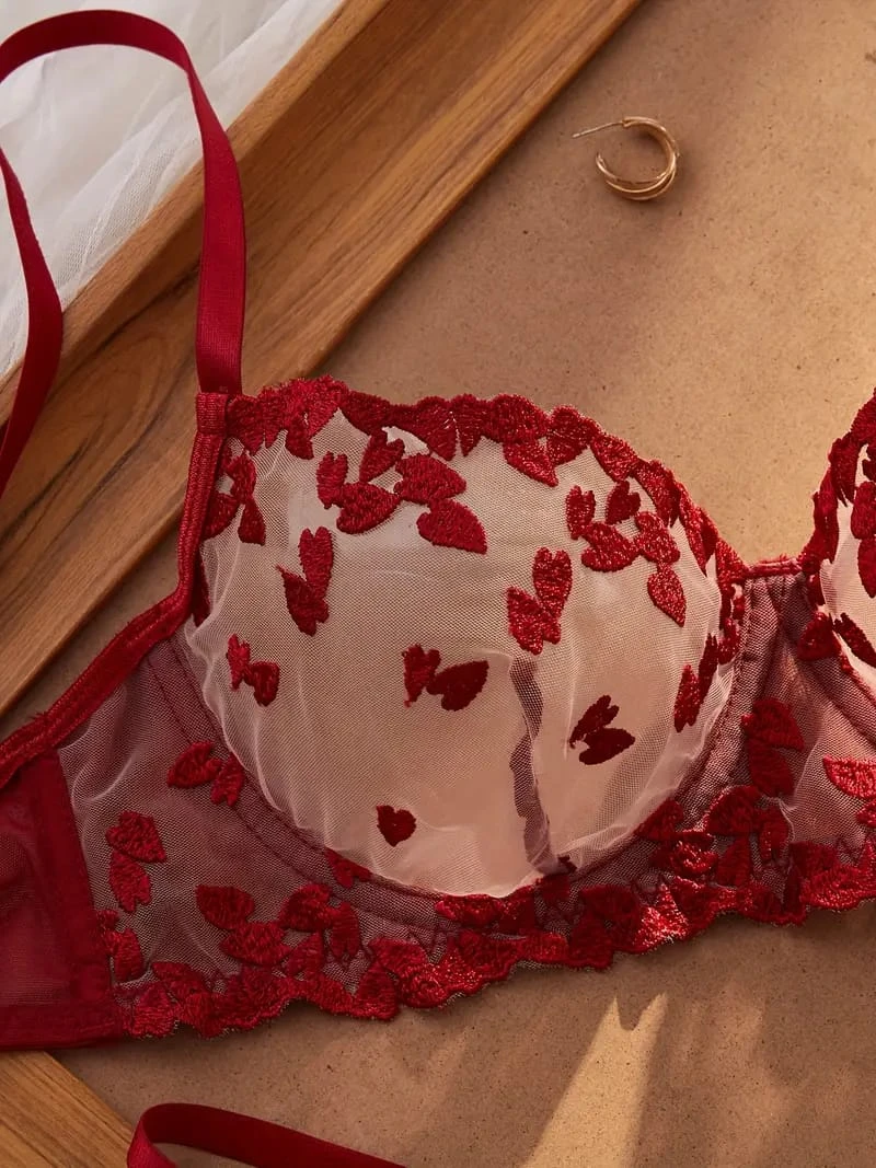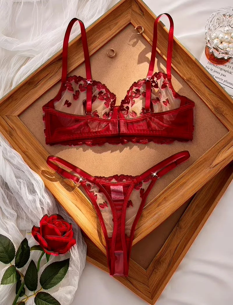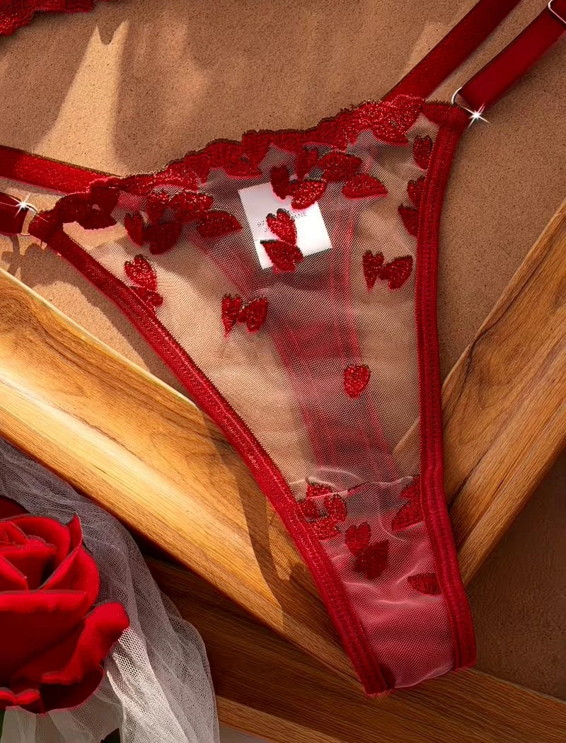 Elevate your romantic collection with this stunning two-piece lingerie set. Crafted from sheer mesh and adorned with intricate 3D red heart embroidery, this set exudes elegance and passion. The underwired bra provides excellent support and features adjustable straps for a custom fit, paired with a matching low-rise thong. It’s the perfect choice for Valentine’s Day or any special occasion where you want to feel confident and alluring.