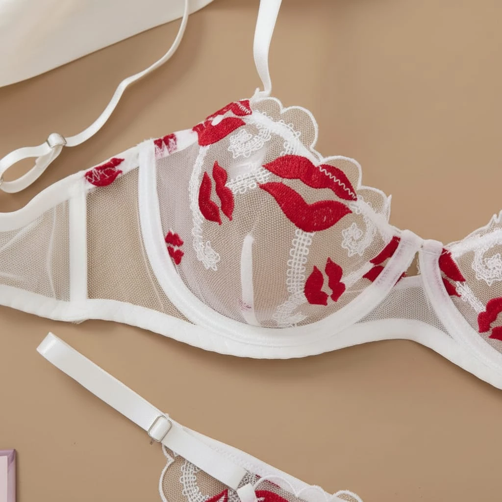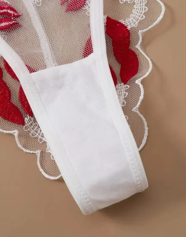 This elegant and sexy two-piece lingerie set features a modern sheer mesh fabric adorned with delicate red lips embroidery. The bra is designed with underwired cups for optimal support and lift, accompanied by adjustable spaghetti straps for a custom fit. The matching thong follows the same provocative theme with scalloped lace edges, making it an ideal choice for romantic occasions like Valentine's Day or anniversaries