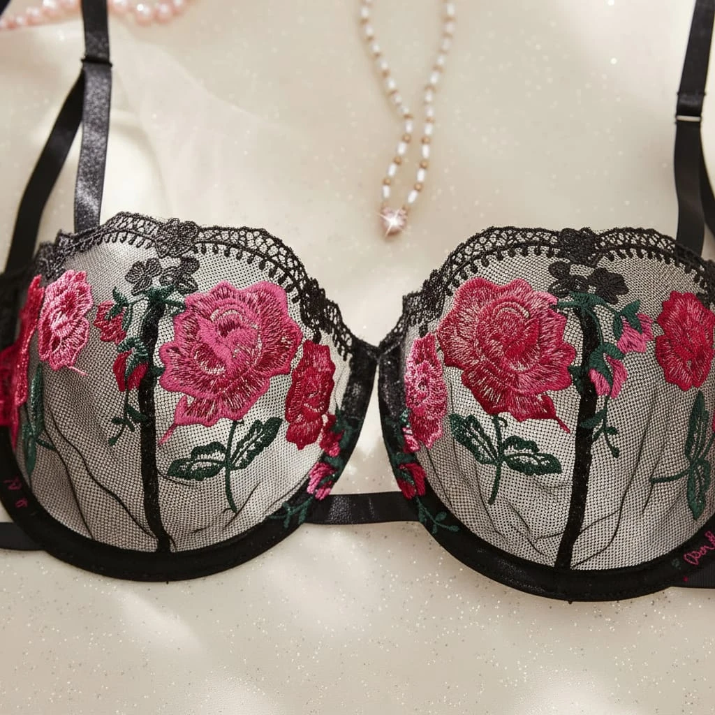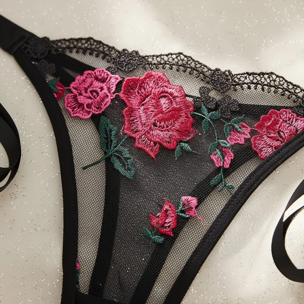 This exquisite lingerie set features intricate red rose floral embroidery on delicate sheer black mesh. The balconette-style bra includes underwire for support and stylish double-strap detailing. The matching thong features adjustable side-tie straps, offering a romantic and seductive look that beautifully highlights the silhouette.
