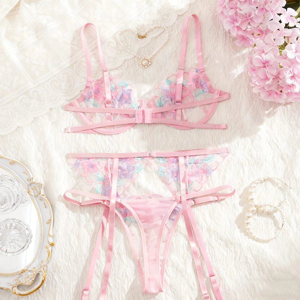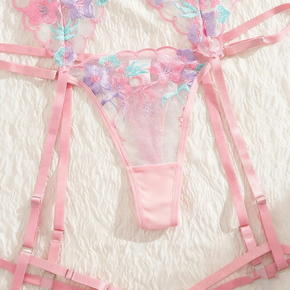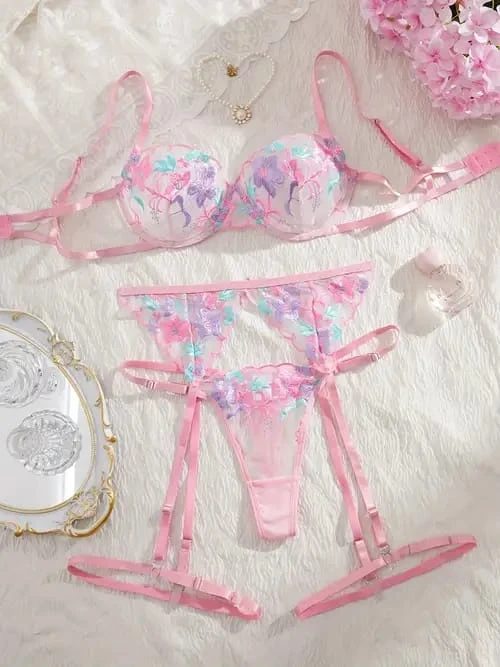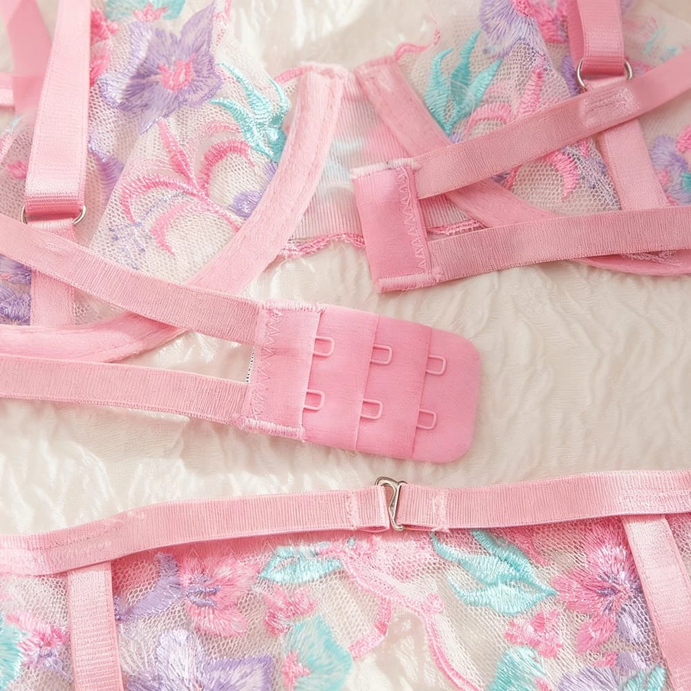 Embrace romantic elegance with this stunning lingerie set featuring delicate multi-colored floral embroidery on sheer mesh. The set includes an underwire bra for superior lift and support, a matching G-string thong, and a decorative garter belt with adjustable straps and metal ring details. Crafted from soft, breathable fabric, it offers a luxurious feel and a perfect fit for special occasions.