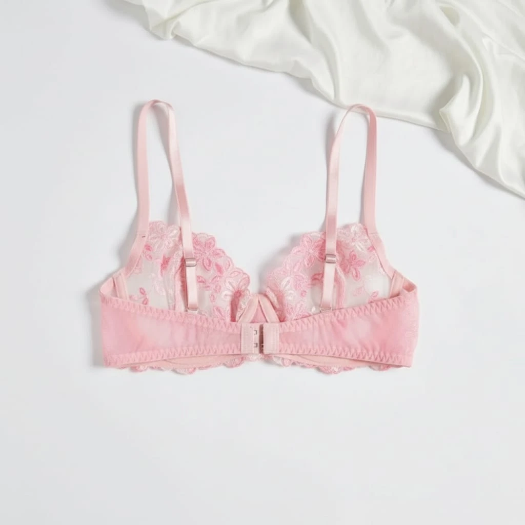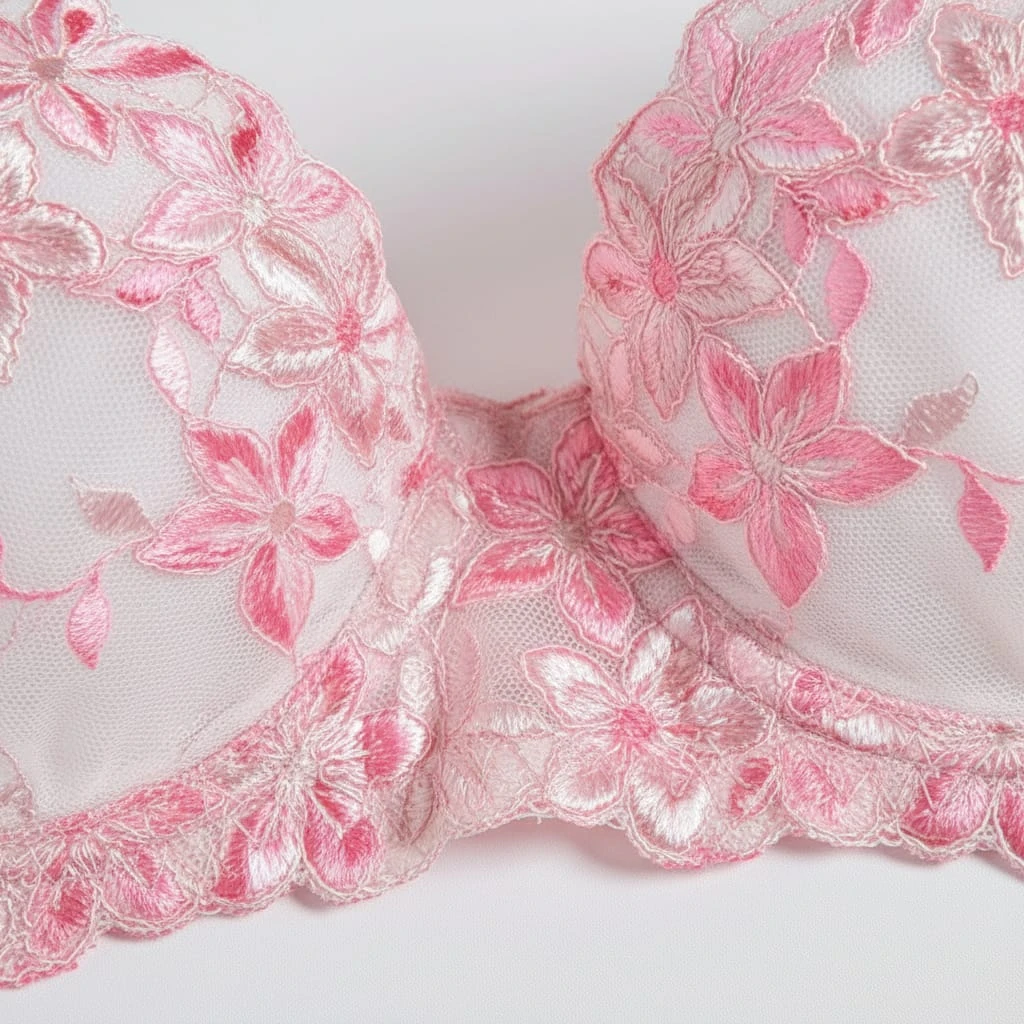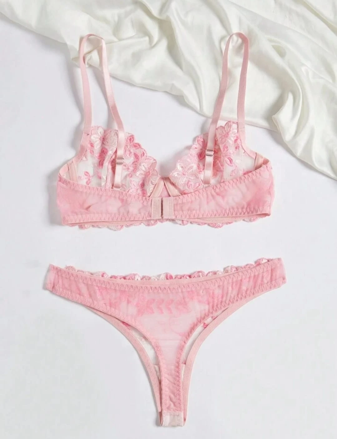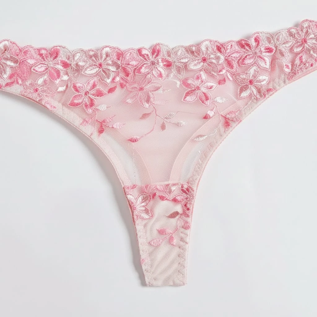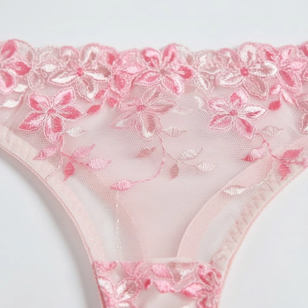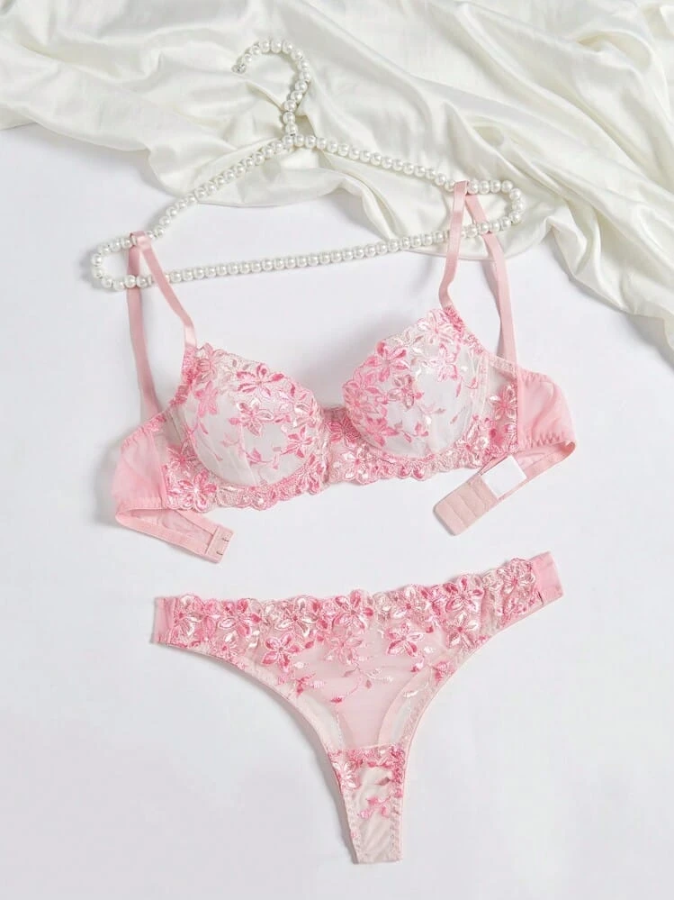 Indulge in romantic elegance with this exquisite pink lingerie set featuring delicate floral embroidery. The underwire bra showcases intricate rose patterns on a sheer mesh backdrop, providing both high support and a stunning "push-up" effect. Paired with a matching thong panty that mirrors the floral artistry, this lightweight and soft set ensures a luxurious feel against the skin. Perfect for honeymoons, anniversaries, or romantic nights.