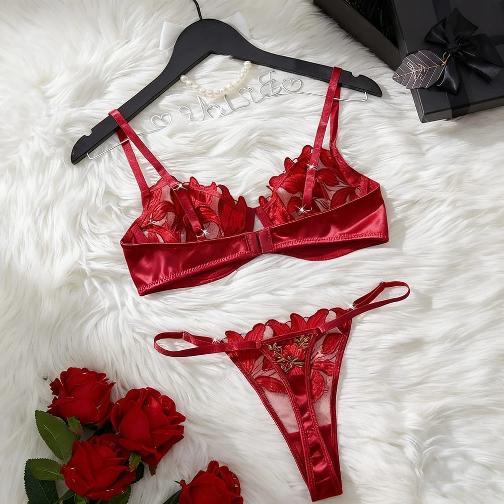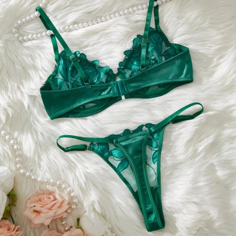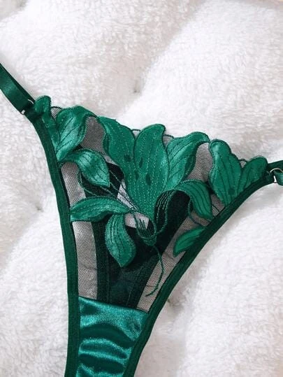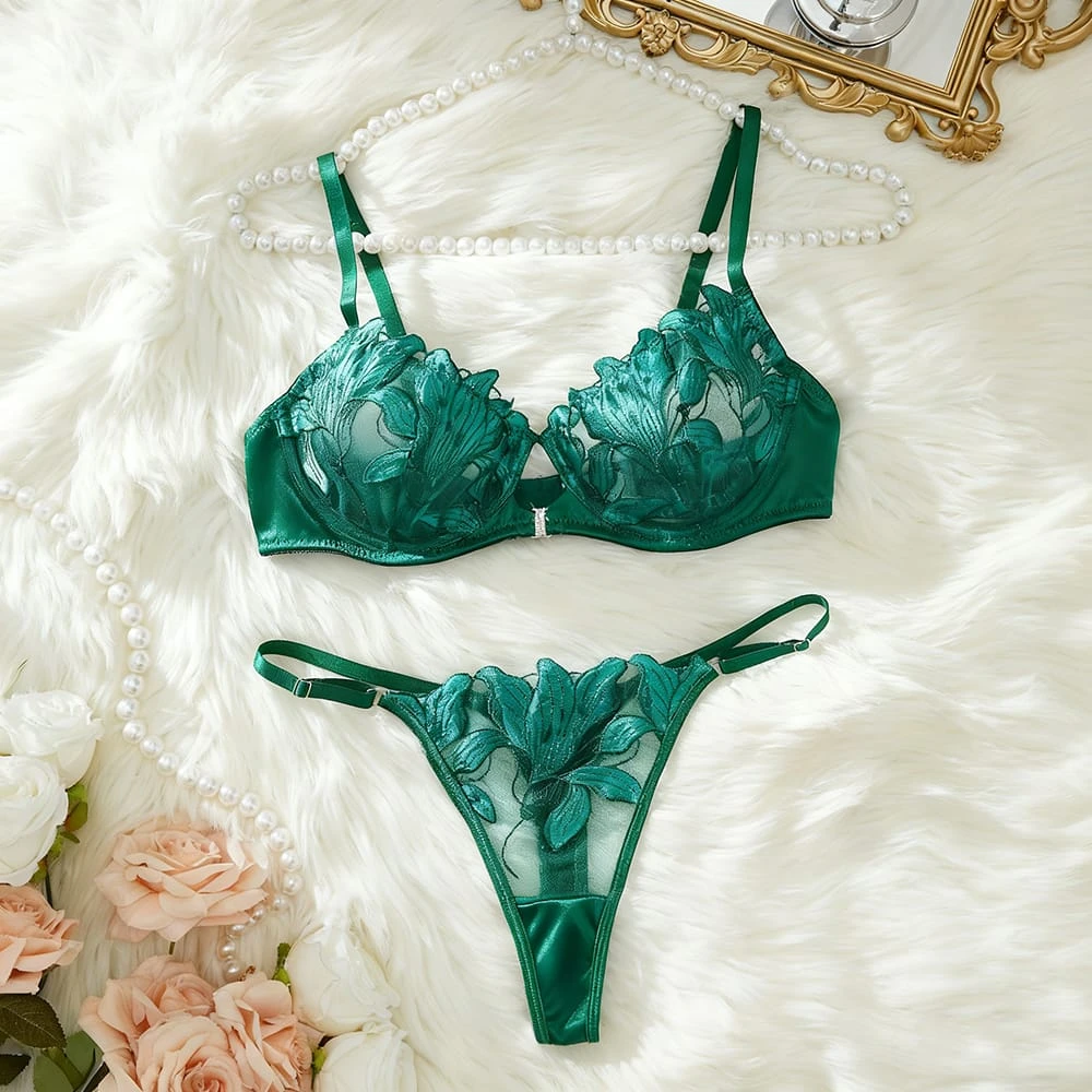 Indulge in French elegance with this luxurious emerald green lingerie set. It features a sophisticated design blending allure and refinement, adorned with intricate 3D floral embroidery on sheer mesh panels. The underwire bra provides perfect lift and support, while the matching low-rise thong includes elastic side straps for ultimate comfort and a seamless fit.