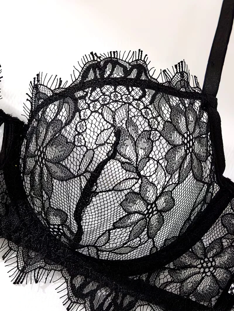 Elevate your intimate collection with this exquisite 2-piece black lace lingerie set. It features a sheer floral lace bra with delicate eyelash trim and underwire cups for superior support and a flattering lift. The set is completed with a matching lace thong, featuring adjustable side straps to ensure a perfect, comfortable fit. Crafted from high-quality, breathable lace for a romantic and sophisticated look.