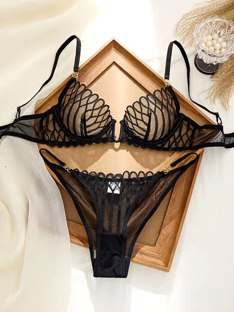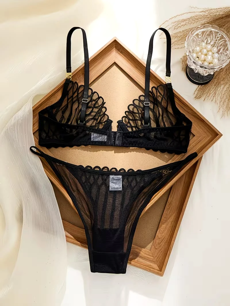 A chic 2-piece set featuring a scallop-embroidered underwire bra and a matching sheer thong. Lightweight, elegant, and designed for a perfect fit.