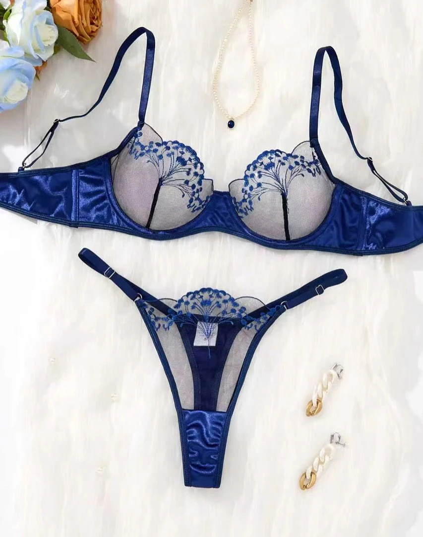 Experience elegance and sensuality with this 2-piece sheer black lingerie set. Featuring intricate daisy floral embroidery on delicate mesh fabric, the set includes an underwired push-up bra for perfect support and a matching low-rise thong. Crafted from soft, breathable, and stretchy lace, it’s designed to provide a comfortable fit while highlighting your natural curves.