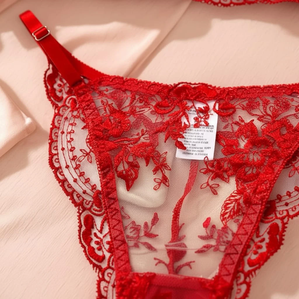 Elevate your romantic collection with this exquisite 2-piece lingerie set. Crafted from sheer mesh fabric, it features intricate floral embroidery in a vibrant red hue. The underwired bra provides perfect support and lifting, complemented by adjustable straps and a matching low-rise thong. Designed for a blend of comfort and timeless elegance