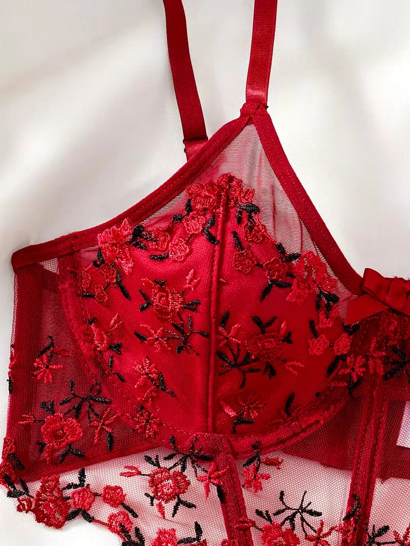Embrace your femininity with this exquisite 2-piece red lingerie set. The underwired push-up bra provides excellent lift and support, featuring delicate sheer mesh adorned with intricate red and black floral embroidery. It comes with a matching sheer thong, both detailed with romantic floral motifs. Designed with adjustable straps and high-quality lace, this set is perfect for special occasions or adding a touch of luxury to your collection
