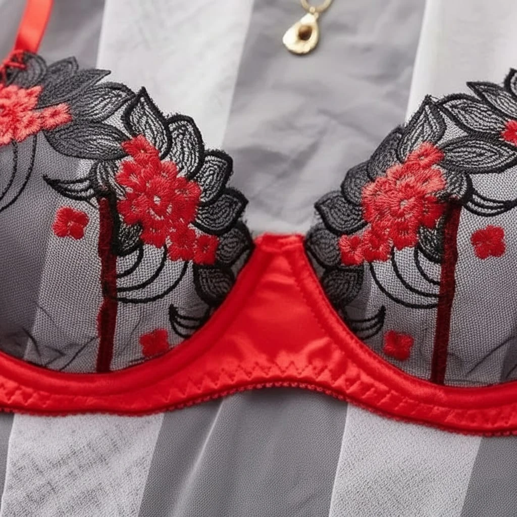 Elevate your intimate collection with this stunning 2-piece lingerie set. Featuring an underwired bra for superior lift and support, adorned with exquisite red and black floral embroidery on delicate sheer mesh. The set includes a matching G-string panty with adjustable satin straps for a perfect, customized fit. Crafted from high-quality, breathable fabric, this set is the perfect choice for romantic nights, anniversaries, or Valentine's Day.