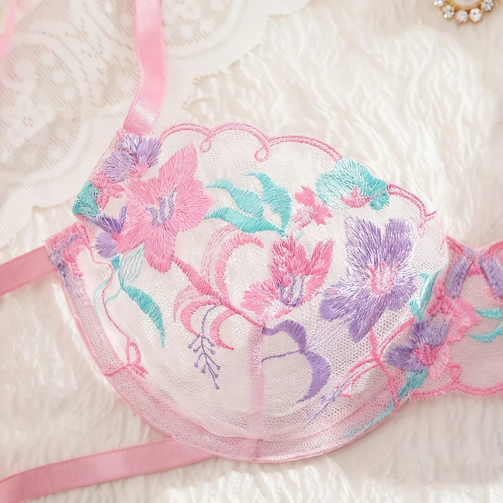 Embrace romantic elegance with this stunning lingerie set featuring delicate multi-colored floral embroidery on sheer mesh. The set includes an underwire bra for superior lift and support, a matching G-string thong, and a decorative garter belt with adjustable straps and metal ring details. Crafted from soft, breathable fabric, it offers a luxurious feel and a perfect fit for special occasions.