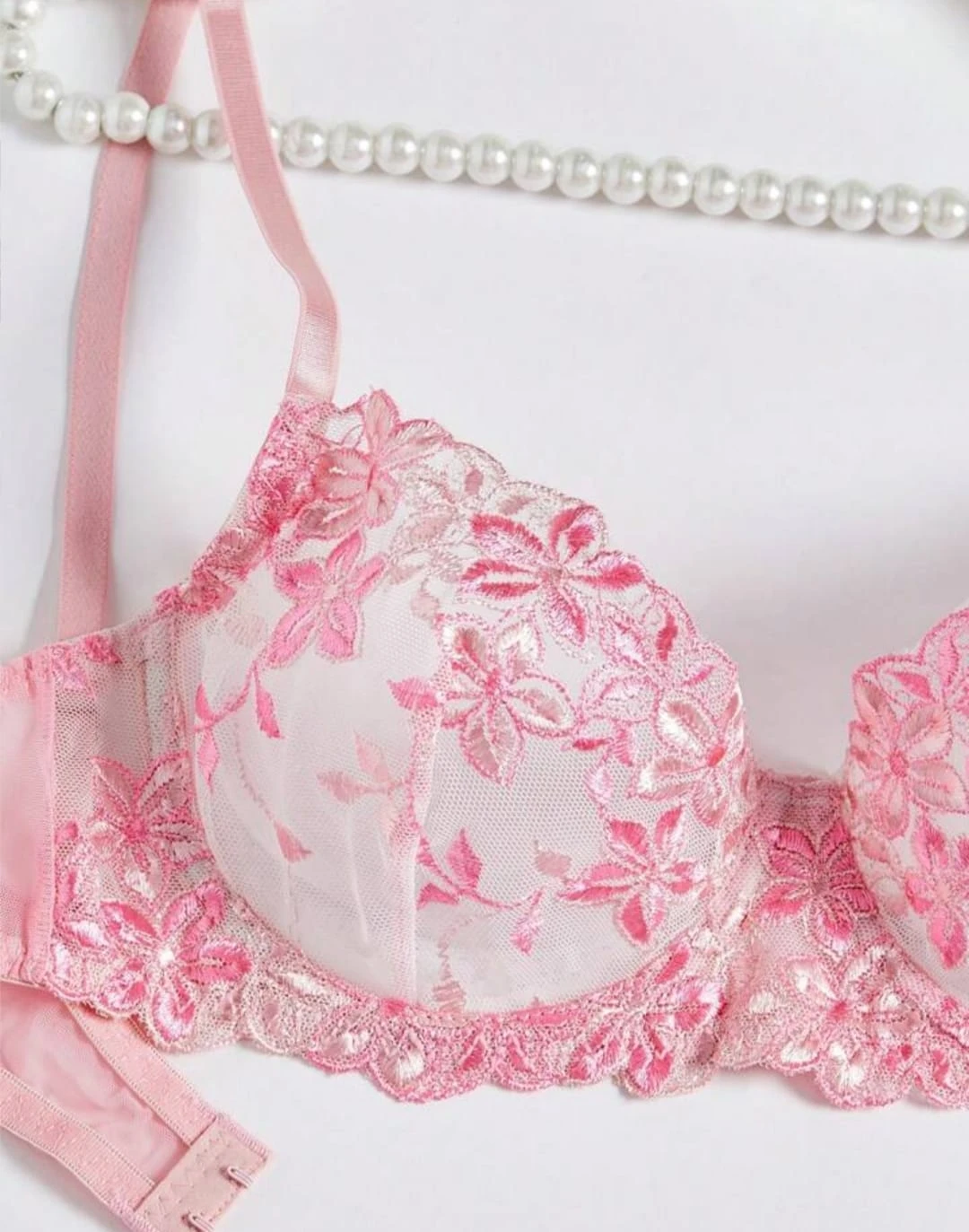 Indulge in romantic elegance with this exquisite pink lingerie set featuring delicate floral embroidery. The underwire bra showcases intricate rose patterns on a sheer mesh backdrop, providing both high support and a stunning "push-up" effect. Paired with a matching thong panty that mirrors the floral artistry, this lightweight and soft set ensures a luxurious feel against the skin. Perfect for honeymoons, anniversaries, or romantic nights.